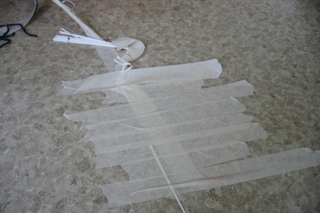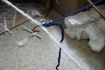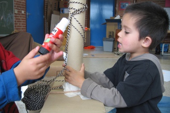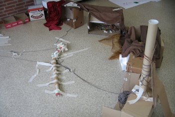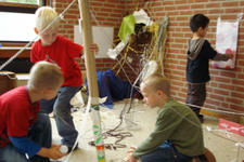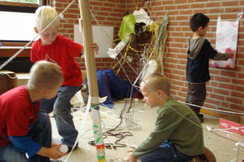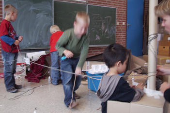 De kinderen werken met wol, touw en plakband. Er ontstaat een ingewikkelde structuur van lijnen en verbindingen.