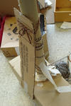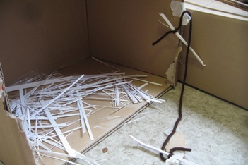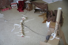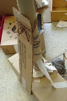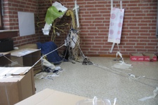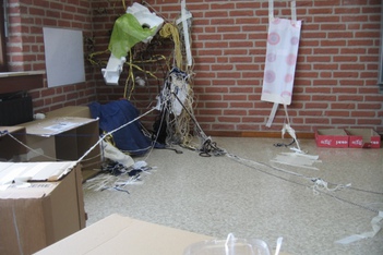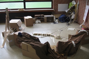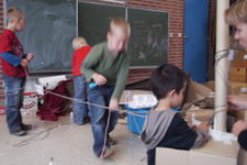 Jesse en Stijn zetten in het midden van de hut ook een lange kartonnen koker neer, ook die willen ze zelfstandig rechtop laten staan. Er wordt overlegd en samengewerkt. Ze gebruiken draden en tape om een goede bevestiging te maken. Maar hij blijft niet staan.