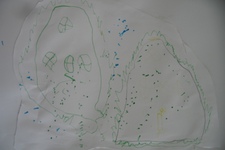 Het huis van Thomas is geel en het dak is bruin en binnen in het huis zijn spulletjes.