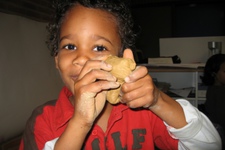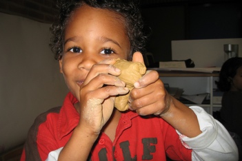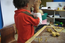 Net als de vorige keer kneedt hij aan het einde alle klei weer tot een hoop. Hij stopt de klei op zijn rug onder zijn trui en moet hartelijk lachen om hoe dat voelt. Hij laat mij dit ook voelen.