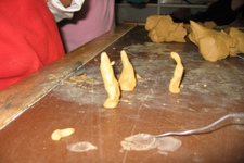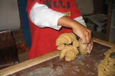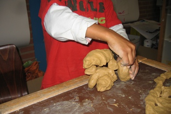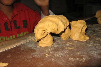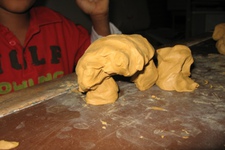 Snel en energiek werkt Eyram aan zijn kleibeeld. Hij trekt zich niets aan van vragen en de antwoorden die die geeft zijn vaak grappend of dollend. Het is mij niet duidelijk geworden wat hij maakte, wat niet geeft de verschillende stadia in zijn beeld vertellen erg veel.