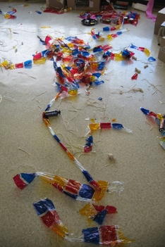Ze gaan in een kring zitten met een berg folie in het midden.