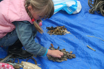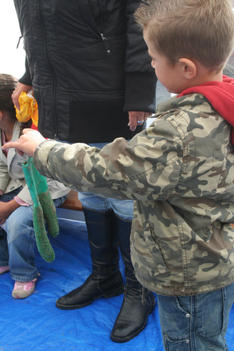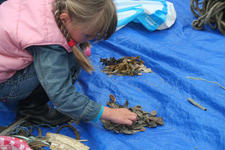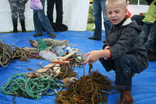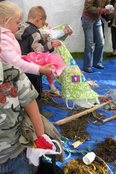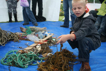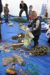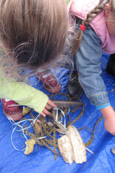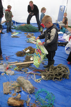 De plastic zakken worden midden in ons atelier geleegd. Er stijgt direct een zilte zeelucht op. De meeste vondsten zijn touw of wier. Maar ook een handschoen, plastic flessen, rietjes, vele schelpen en mooie stukken verweerd hout. Een aantal kinderen begint direct met de vondsten te spelen. Ook wordt uitgebreid bij elkaar gekeken wat de ander meegenomen heeft.