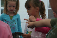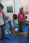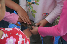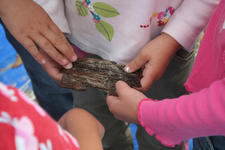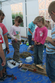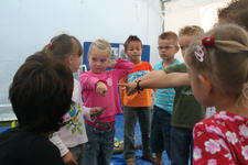Cindy vraagt: Wat is dit? Ria vraagt het aan de andere kinderen. Een paar kinderen weten het en steken hun vinger op. Karlijn zegt: Het is hout! En laat Cindy zien waar ze het neer kan leggen. Yannick twijfelt: Weten jullie het zeker? Ze voelen allemaal nog een keer aan het stukje hout. Ja! Het is echt hout!