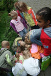 De kinderen vinden een slak. En kijken allemaal heel aandachtig wat die slak aan het doen is: hij eet een appel!