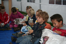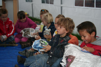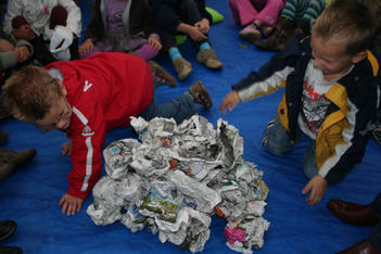 Floor laat het verschil zien tussen plat en ruimtelijk aan de hand van kranten. We maken proppen van een pagina uit de krant en leggen die op een hoop. Dat neemt veel meer ruimte in dan de platte krant.