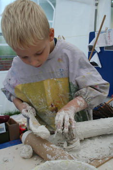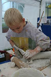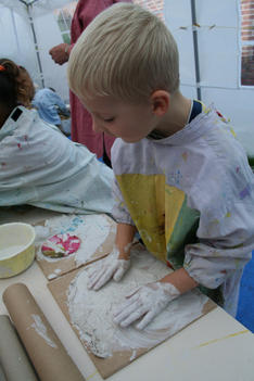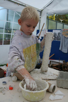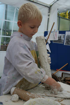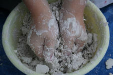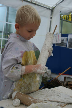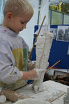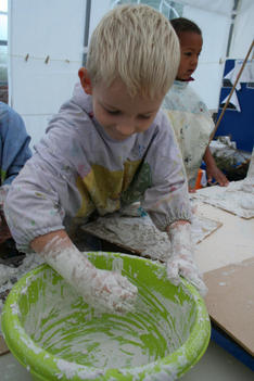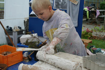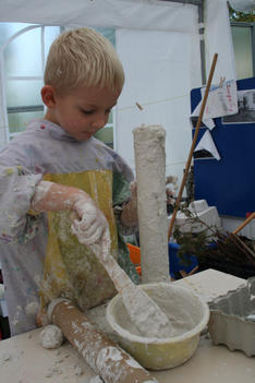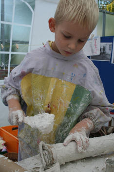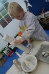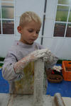 Chris begint met wrijven. De gips wordt op de plank gesmeerd. Dat voelt lekker! Hij voelt vervolgens hoe de gips hard wordt in de bak. Dan speelt hij met de gipskorrels. Vervolgens smeert hij gips op een rol. En gebruikt gips als lijm. Dan vult hij de rol met gipsproppen: dat zijn de kogels van zijn kanon, aldus Chris.