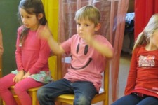 De kinderen zijn heel geconcentreerd als ze 'shiri yakanaka' leren. Ze vinden het leuk om erbij te bewegen. Het liedje fluiten vinden ze ook leuk. Marcela laat graag aan iedereen horen hoe mooi ze kan fluiten. Kylian heeft een leuk idee: in plaats van 'gewoon' te klappen slaat hij twee keer op zijn knieën en dan klapt hij in zijn handen. Dat doen we dan met z'n allen.