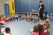 Hoewel de kinderen een drukke en moeilijke ochtend achter de rug hadden i.v.m. de CITO toets en aanhoudende regen zitten ze doodstil naar Marjanne te kijken en te luisteren: ze zijn helemaal in de ban van haar klarinet! Het is heel mooi om dit te zien! Hopelijk neemt juf Marjanne haar klarinet nog eens mee naar school!