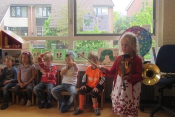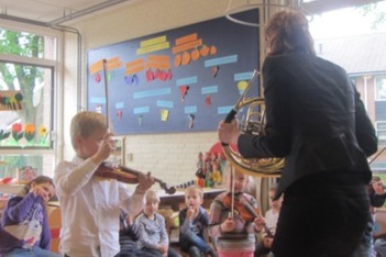 Dan oefenen we de Ierse Jig. De kinderen spelen viool (de rest speelt lucht-viool) en iedereen zingt mee. Iris speelt het liedje op hoorn, dat klinkt heel anders dan wanneer Sinfonietta er is, maar om te oefenen werkt het wel.