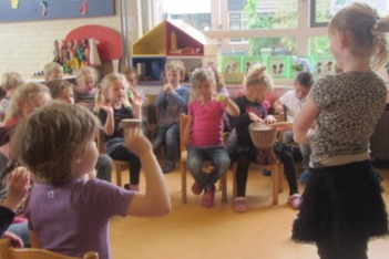 We oefenen ook het lied 'Iedereen die trommelt is een muzikant', waarbij de kinderen de verschillende geluiden van bodypercussie ontdekken: trommelen op je knie, je schoen, je been, je hand, je arm, etc etc.