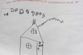 Rens tekent zijn hele huis met het hele gezin er in: "Mama is panneknoeken aan het maken. Iedereen houdt zijn handen op zijn horen om goed te horen."