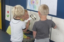 Tijdens het vrije werken gebeurt er van alles. Milos heeft zijn eigen trommel meegenomen, en samen met Thijs en Tiago verklankt hij allerlei tekeningen die aan de muur hangen.