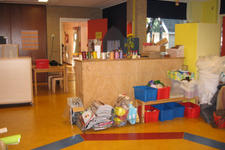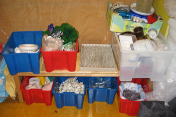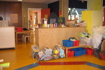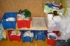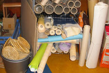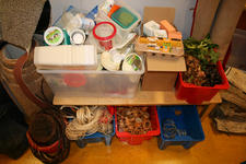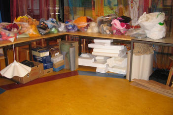 Via een oproep aan ouders is er allerlei materiaal naar school gebracht: van behangrollen tot tegels, van piepschuim tot lappen stof, van hout tot miniscule flesjes. Alles wordt geordend in bakken, dozen en zakken en overzichtelijk uitgestald langs de wanden van het atelier.