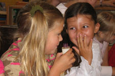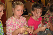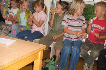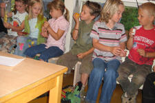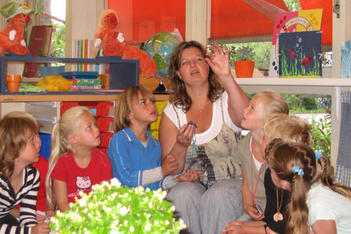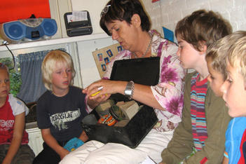 De kunstenaars en stagiaire hebben ieder een verzameling meegenomen: een verzameling die alleen kan horen, een verzameling plastic flesjes, een verzameltas met voel, ruik en kijkdingen. De juffen verzamelen ook: een verzameling geluk in een piepklein zakje, een hele oude kist met gereedschap en schroefjes van jufs vader, een boekenverzameling met poppen die erbij passen.