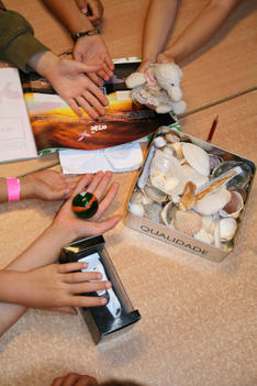 Nadat de kinderen hebben kennis gemaakt met verzamelingen van anderen mogen ze hun dingen laten zien die ze zelf verzamelen: knikkers, plaatjes, knuffels, apparaten om uit elkaar te halen, schelpen, stenen... We ruiken, kijken, voelen en luisteren naar de kleine, grote, lekkere, lieve, harde, zachte, doorzichtige, scherpe dingen en geluiden die iedereen heeft mee genomen. In kleine groepjes zoeken we naar eigenschappen van de dingen die meegenomen zijn door de kinderen.
