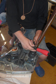 Het was prettig om in kleinere groepjes verder te gaan met het bekijken van de dingen die de kinderen van thuis hadden meegebracht. Het viel op dat het vooral om 'hebbedingen' ging zoals knuffels en plaatjes. Eén jongen nam meteen al met een eigen creatie; een vliegtuig van een skateboard, een houten tafel, een fietsbel, een lampje voor een lampion en een zaag.