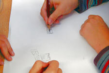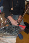 Bij het zoeken van materiaal dat bij de meegebrachte dingen past, gingen de kinderen eigenlijk allemaal meteen "iets maken": bedjes, boten, potjes vullen met kralen......... niet de bedoeling, maar wel goed als verkenning van het materiaal in het atelier. Alle kinderen liepen door elkaar, het was moeilijk voor kunstenaar, stagiaires en juffen om overzicht te houden. Liesbeth vond het een hoog 'knutselgehalte' hebben. Marianne en Silvie zagen wel mooie dingen gebeuren.