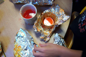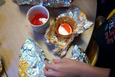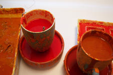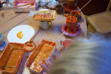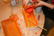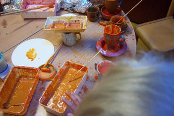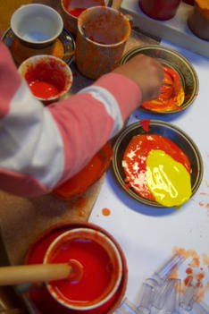 De groep splitste zich onmiddellijk, Casper en Fin wilden verder met hun boot en de kinderden die gisteren bezig waren met de prutjes wilden er heel erg graag mee verder. Ze concludeerden dat het een soort verf geworden was en probeerden een rood schilderij te maken met allerlei rode tinten.