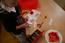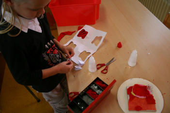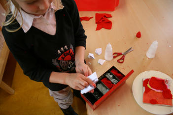 Sanne en Annemarie hebben zich aan een aparte tafel teruggetrokken. Sanne heeft een rode doos met gleufjes in het deksel. In de vakjes binnen in de doos legt mooie dingen neer. Van papier knipt ze witte briefjes. Die stopt ze door de gleufjes in het doosje.