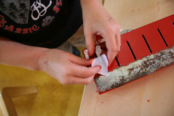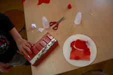 Na het schilderen vult Tobias kleine flesjes met het rood gekleurde verfwater. Daarna pakt hij een "eikel, nee een.... denneappel" uit het atelier. Die moet worden ingepakt in rood cellofaan. Met plakband. Een klein stukje denneappel blijft uitsteken, dat wordt roze geschilderd. De denneappel moet onderdeel worden van een groter werk: "hij moet ergens op". Eerst wordt hij in een lijmpotje gezet. Daarna gaat Tobias met Madelon naar de werkbank om een lege colafles door te zagen: "dan kan de eikel daarin". Ze komen terug:"het lukt niet". Dan pakken ze ribkarton en gaan dat in rode banen schilderen. Ze willen dunnen streepjes maken licht en donkerrood. De verf is nat en loopt uit. Ze maken er grotere banen rood van. Op een rand wordt cellofaanpapier neergelegd.