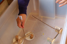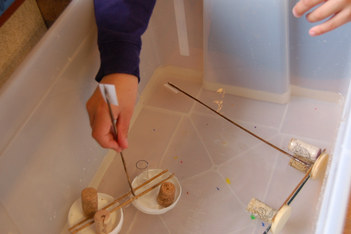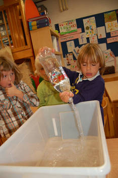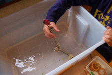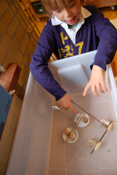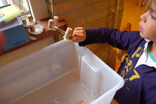 Bootjes: Vanochtend vullen we een bak met water en proberen Liam en Casper wat er zoal blijft drijven.