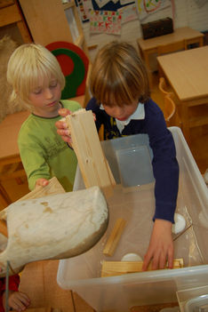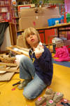 Nu hij zijn bootje bekijkt krijgt hij een nieuwe ingeving. “Jaaaa, nu weet ik het!” Hij staat op en loopt naar de plek met kurken, haalt er een paar uit en gaat driftig met het lijmpistool aan de slag. Deze twee zijn mijn nichtjes, mijn grote en mijn kleine nicht.
