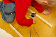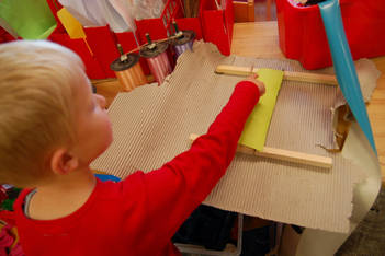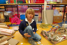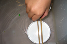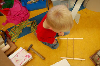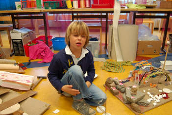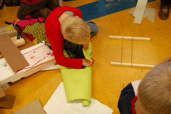 Even voor de pauze lezen we over een Catamaran en hoe je deze kan maken. Casper weet nu wat hij wil: een catamaran maken zoals hij net gezien heeft op het plaatje, maar met materiaal uit het atelier waarvan hij heeft geprobeerd of het blijft drijven. Twee ronde palstic schijfjes en twee houten stokjes is het uitgangspunt voor zijn bootje. Ik vraag aan Casper of hij met ogen dicht kan zien hoe een catamaran er uit ziet. Heeft het zeilen en welke vorm hebben deze? (zie foto met ogen dicht). Volgens Casper is een klein zeil goed .