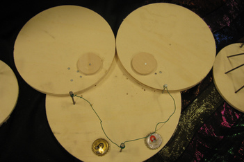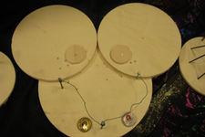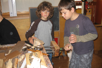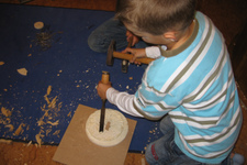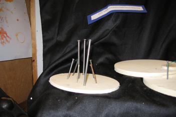 De onderzoeken zijn steeds meer gericht op materiaal en leiden steeds vaker tot abstracte werken: triplex rondjes worden met een beitel bewerkt om te kijken wat dat oplevert, Finn kijkt of je grote spijkers ook in dun plaatmateriaal kan slaan... soms splijt het, maar als je heel zacht slaat blijven de spijkers in het triplex staan.