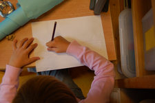 Liam is vandaag ziek. Renee sluit zich vandaag bij de bootjes aan. Casper wil geen bootje meer maken maar wil wel graag een verhaal vertellen op de voicerecorder. Als hij de voicerecorder aanzet heeft hij niet echt een verhaal te vertellen maar vindt hij het gewoon leuk om op de knopjes van de recorder te kunnen drukken en om er rare geluiden in te roepen. Hij herhaalt dit tien keer en ik krijg er eigenlijk niet veel anders uit. Hij gaat aan de slag met een stuk hout en potlood en tekent een bootje op golven hij vertelt dat het stormt, de vrouw is in het water is gevallen.