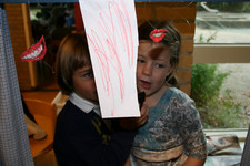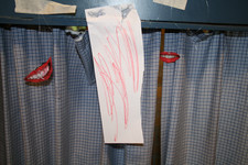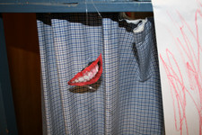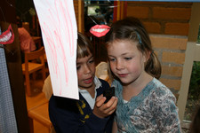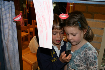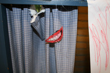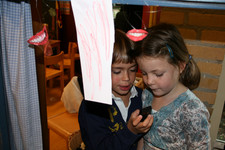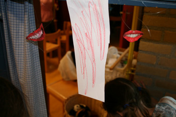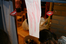Casper en Madelon nemen met een voicerecorder een verhaal over lippen op: “Het gaat over lippen. Het gaat over verliefdheid En het is een leuke voorstelling En ze gaan zoenen”