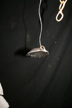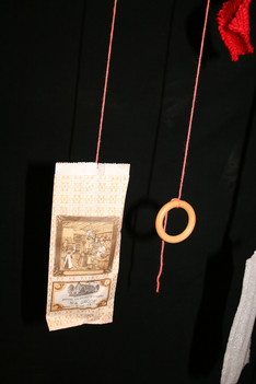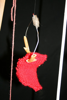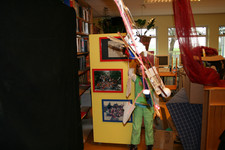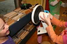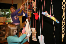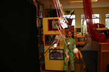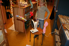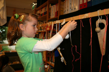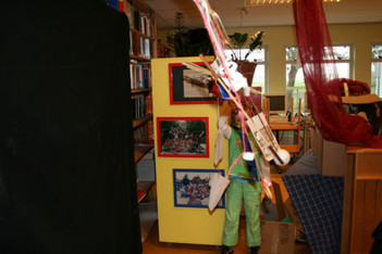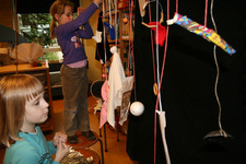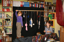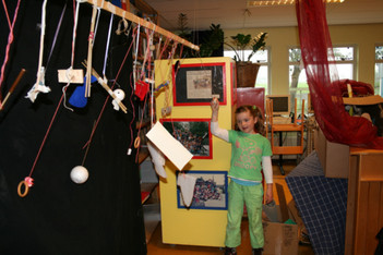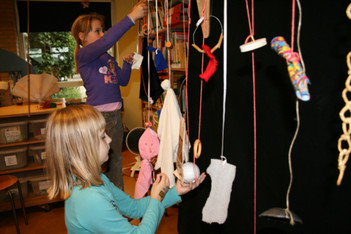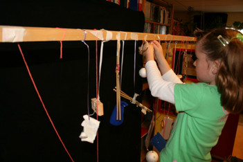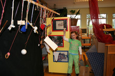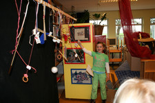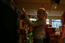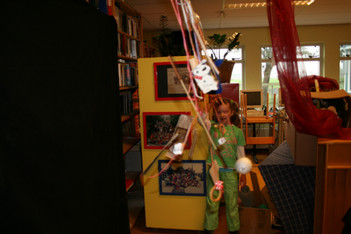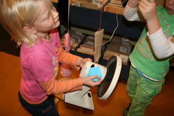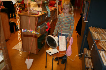 Julia, Laura, Charley, Annemarie, Femke en June spelen met de ventilator. Ze hebben van lapjes stof spookjes gemaakt, die bewegen als je de ventilator erbij houdt. Ze onderzoeken hoe de spookjes hard gaan, hoog gaan, dansen.... Daarna zoeken ze andere dingen die ze kunnen laten bewegen. Een stukje behang, een gebreid rood lapje aan een ijzerdraadje, een blokje hout, een stukje zwart foam, een kurk, een uitgeknipte hond van stof, een papieren zakje.... Alles wordt aan een draadje gehangen: "dan beweegt het makelijker". Al snel raken de draden in de war. Ze vragen aan Liesbeth wat ze daar aan kunnen doen. Die zegt:"kunnen jullie het niet aan een lat hangen?". Er wordt een lat gezocht en die wordt tussen een kast en de poppenkast opgehangen.Alle beweegdingen krijgen een plaats aan de lat...Femke maakt samen met Laura een touw met een kastanje vast aan het uiteinde van de lat. Ze laten een juf op een stukje papier schrijven: hier kan je aan bewegen. Het briefje wordt boven de kastanje gehangen