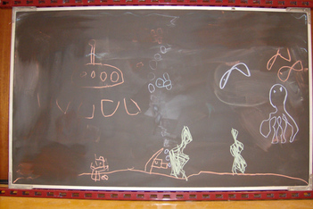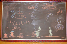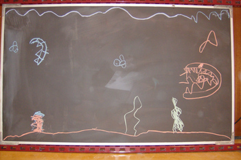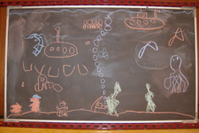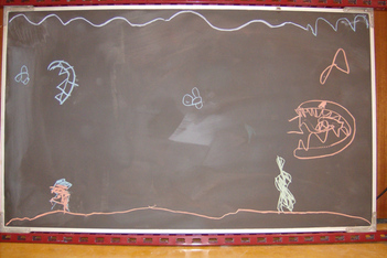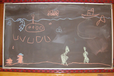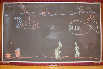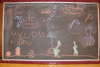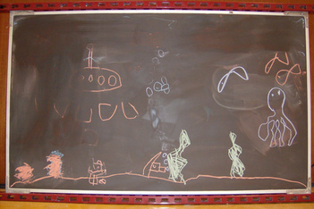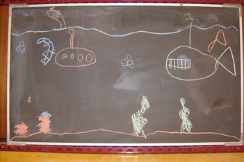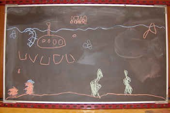 Finn was vandaag naar de tandarts. Dus Mats en Wessel hebben de onderzeetekening opnieuw gedaan. Deze keer was Mats ook aan het tekenen, dus heeft Sanne de foto's gemaakt. Het is een heel mooi filmpje geworden met bootjes die drijven en uiteindelijk zinken, belletjes die langzaam aan de oppervlakte komen en onderzeewezens die elkaar opeten