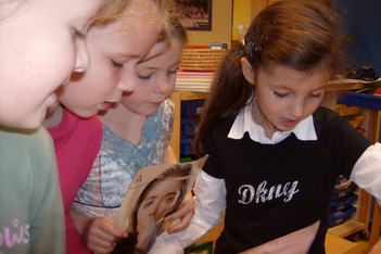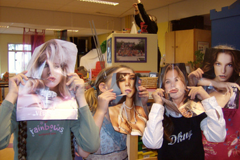 “we hebben de lippen er uit geknipt en doen onze eigen lippen erin” “het zag er heel gek uit” “omdat het er niet bij staat” “nu ga ik lachen” “ik weet er ook één!” Gelach “Het lijkt net of je het echt bent” “Mag ik ook?” “ik doe die en jij doet die” Gelach en gegiechel…. “Ik wil deze doen” “ik doe mijn lippen zo” “nu gaan we ruilen” “zullen we nu samen” “heb jij donkere lippen” “Sanne kijk” “wacht even” “ik neem ze mee naar huis” “ik wil deze” “iedereen pakt ze en legt het niet netjes terug” “we moeten er nog iets van maken, Madelon!” “je kan er ook iets anders achter doen… kijk een lapje” “wat gaan jullie met die lippen doen?” “die gaan we aan een touwtje in de poppenkast hangen”